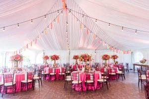 At the conclusion of the cocktail hour, the adults joined the kids inside the tent. Here the tables were beautifully set with pink and white linens and topped with large colorful floral arrangements. Tassels of gold and pink along with white market lights were hung from above to create a carnival feel. The lounge area included pink and white furniture, custom carnival themed pillows and Emma’s name in giant Marquee lights.